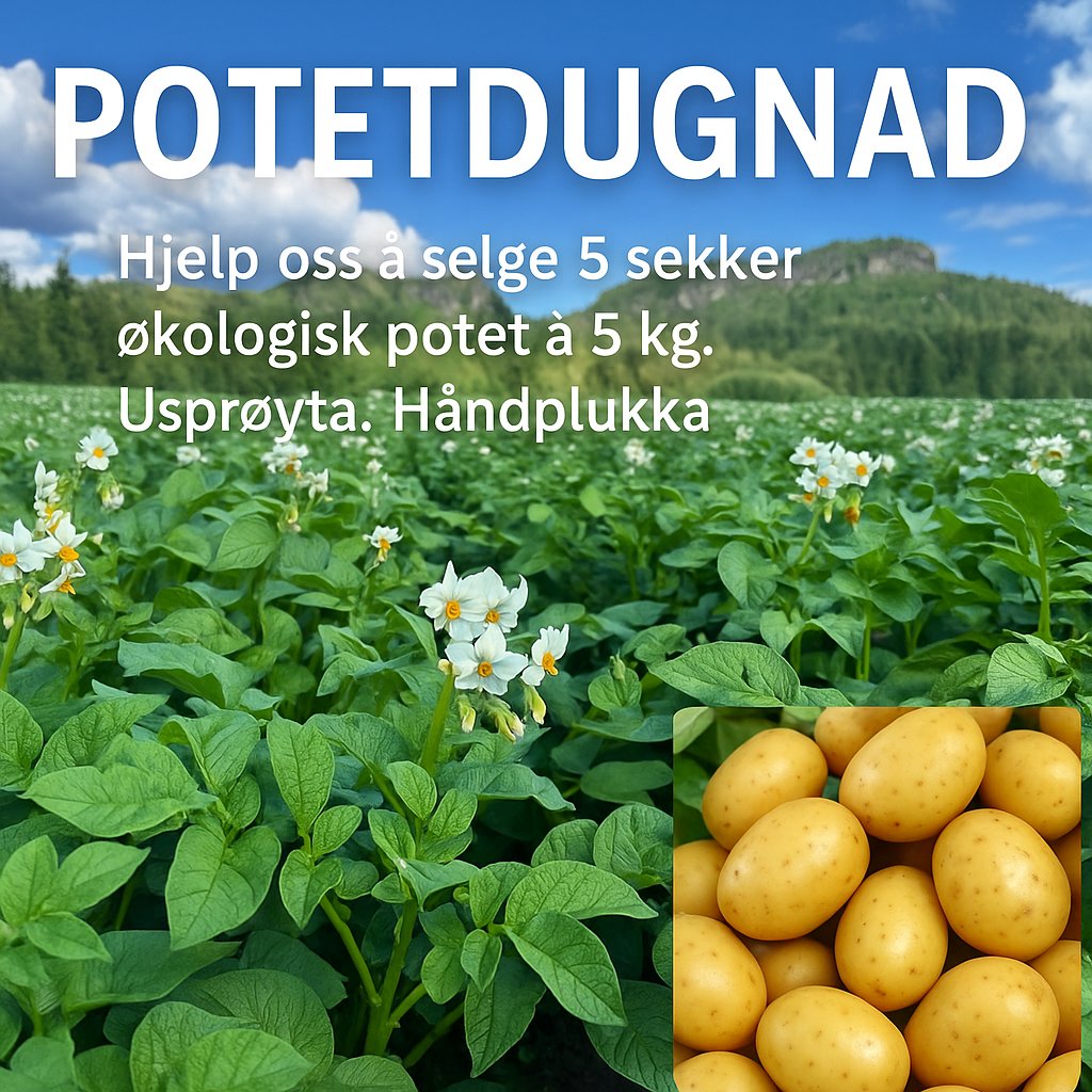 5 sekker a 5 kg Sigrid Undsethpoteter. Vi håndsorterer. Og bruker ingen kunstgjødsel eller sprøytemidler. Kun naturens økosystem og fotosyntesen til hjelp. Og noen griser i forkant 🙂